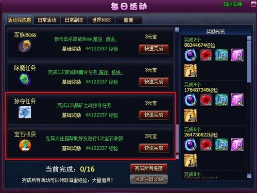 5. “活动完成度”任务新增了掠夺任务、宝石收获任务,完成16个中任意14个完成度任务项都可以领取最高奖励。