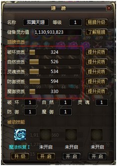 灵力值是翅膀养成的主要数值,灵力值可以用于提升翅膀等级,开启翅膀新技能以及翅膀技能升级,角色获得的灵力值将一直储备在角色中,玩家可以根据自己的需要来分配灵力值使用的方向。