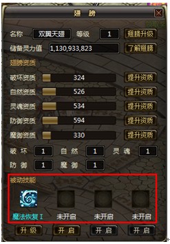 点击翅膀升级按钮即可完成翅膀升级操作,翅膀每次升级将恒定消耗800万灵力值。