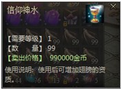 信仰神水可以在五灵珠提升灵力值时随机获得,同时也可以在商城中(售价98元宝)购买到】