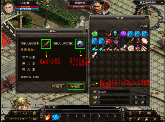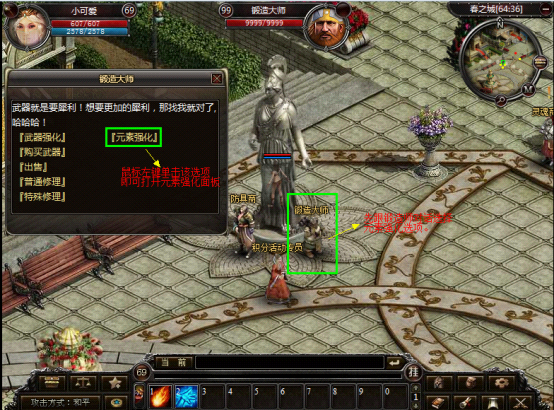 1. 在锻造师处可以进行装备的元素强化,华景村的(99,32)和春之城的(66,38)处各有一个锻造师。