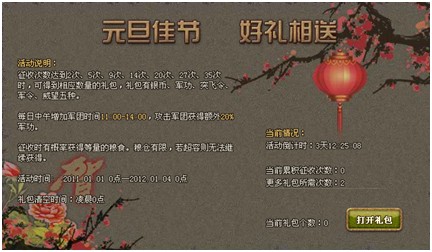 【活动内容】:征收次数达到2次、5次、9次、14次、20次、27次、35次时,可得到相应数量的礼包,礼包有银币、军功、突飞令、军令、威望五种!